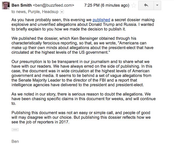 Ben Smith, BuzzFeed’s editor-in-chief, explained the decision to publish the unsubstantiated claims: “Americans can make up their own minds.”